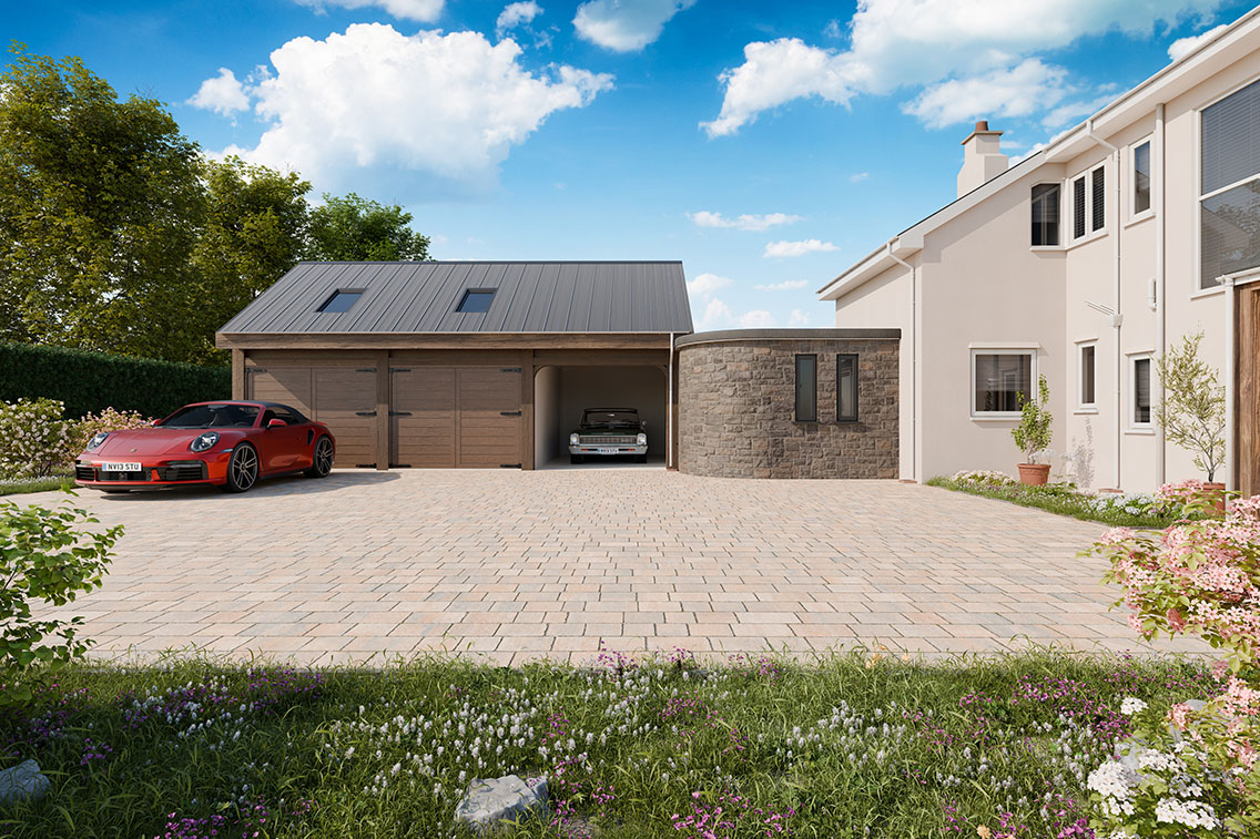 The scheme is formed in two parts: a timber-framed three-bay garage, and a striking flat-roof link that connects the new structure to the house.